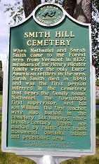 When Nathaniel and Sarah Smith came to the Forest area from Vermont in 1837, members of the Henry Hiester family were the only Euro-American settlers in the area. Sarah Smith died in 1848 and was the first person interred in the cemetery that bears the family name. Nathaniel, the townships first supervisor, and his son William, the first teacher, were also buried in the cemetery. Six hundred nine-teenth century graves are marked by rustic tree trunk monuments, obelisks, tablets and pedestaled urns.